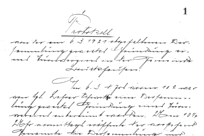 Erste Mitgliederversammlung mt 72 Mitgliedern zur Bestätigung des Gründungsaktes, der Wahl des Vorstandes und zur Festsetzung des Vereinsbeitrages.