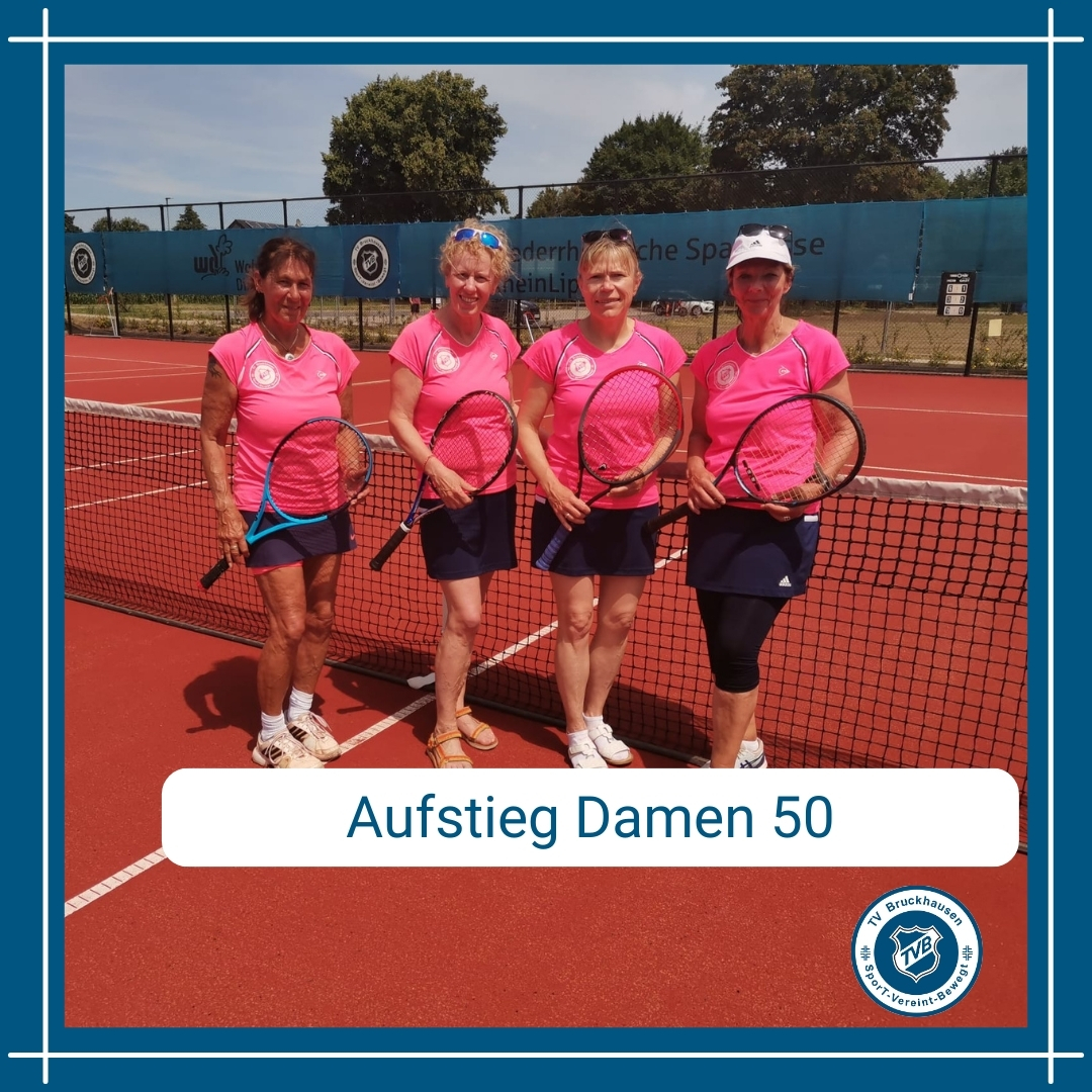 Die Damen 50 machten am letzten Spieltag in der Bezirksliga mit einem 6:0 Heimsieg gegen den SV Biemenhorst den Aufstieg in die 2. Verbandsliga perfekt. Mit insgesamt 5:1 Siegen verwiesen sie die punktgleichen Damen des Meiderich 03 aufgrund der besseren Matchpunktbilanz auf den zweiten Platz.