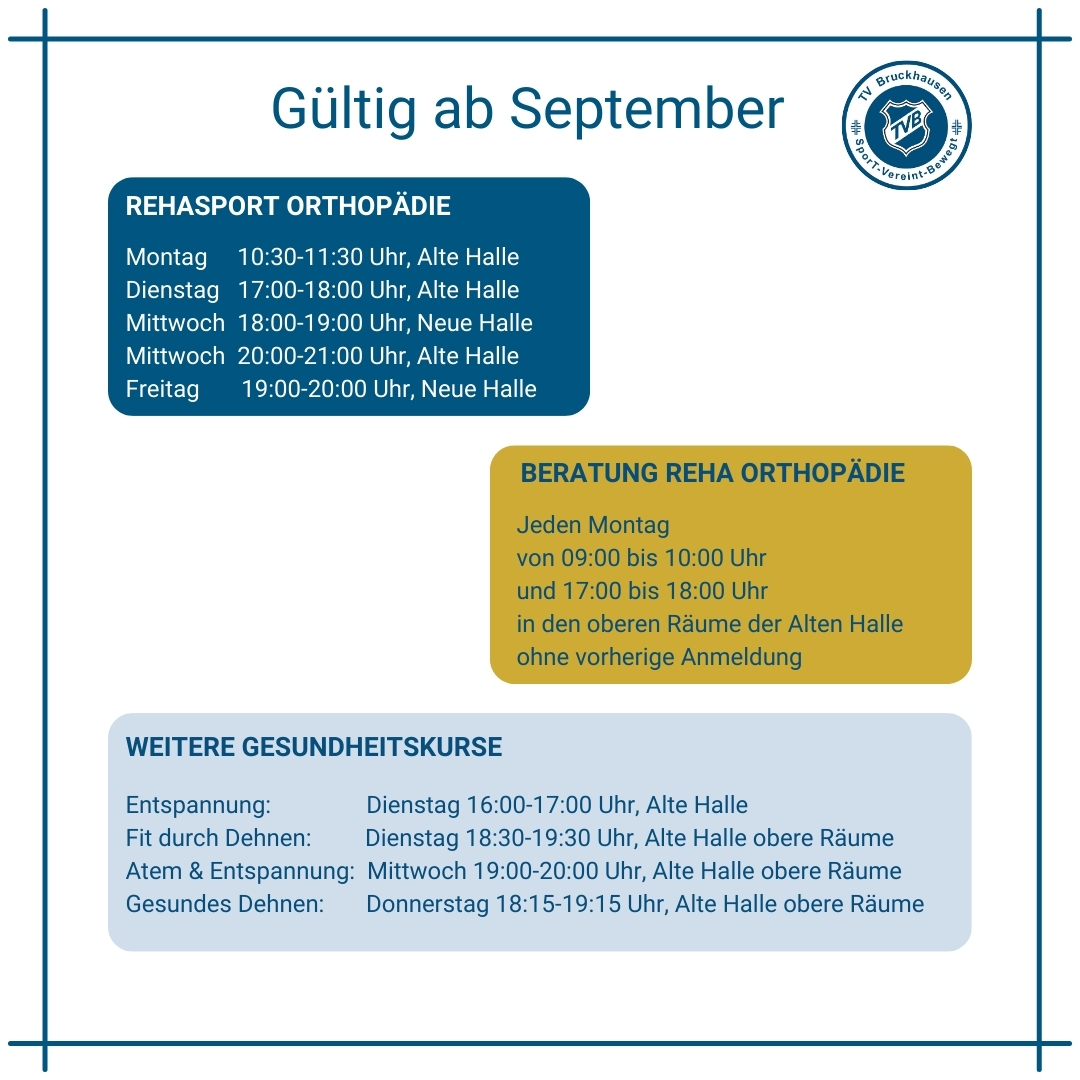 Insbesondere unser Angebot für Rehasport Orthopädie können wir so deutlich ausweiten. Für die Teilnahme an den Kursen ist eine ärztliche Verordnung erforderlich, aber keine Mitgliedschaft im TVB. 😊