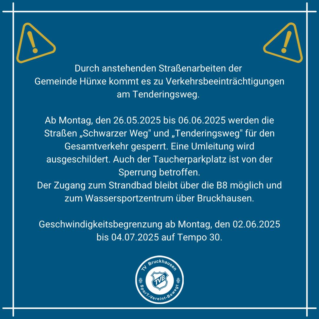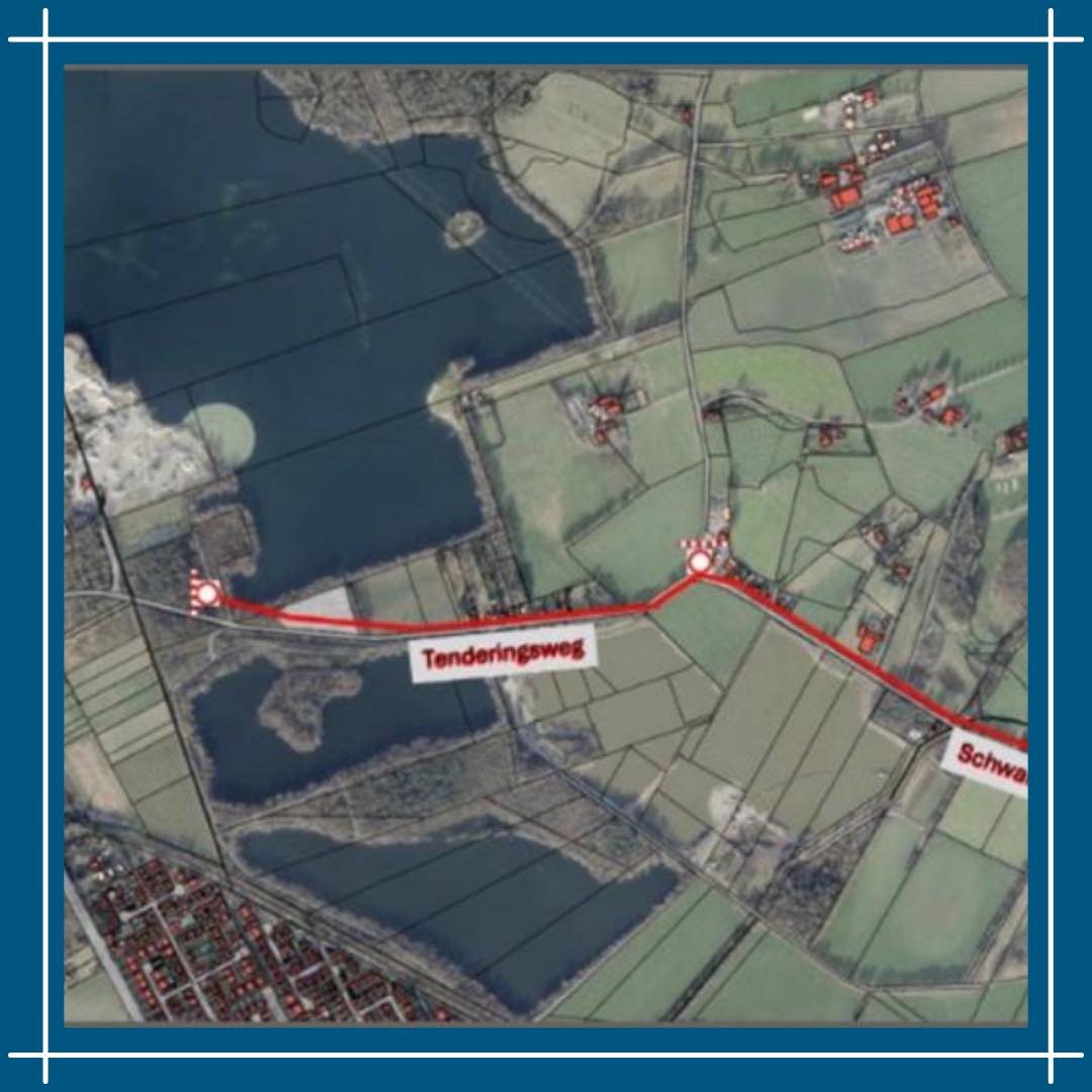 Wegen Straßenarbeiten wird ab Montag, den 26.05.2025 bis 06.06.2025 die Straßen „Schwarzer Weg" und „Tenderingsweg" für den Gesamtverkehr gesperrt. Eine Umleitung wird ausgeschildert. Auch der Taucherparkplatz zum Angel- / Tauchsee ist von der Sperrung betroffen.